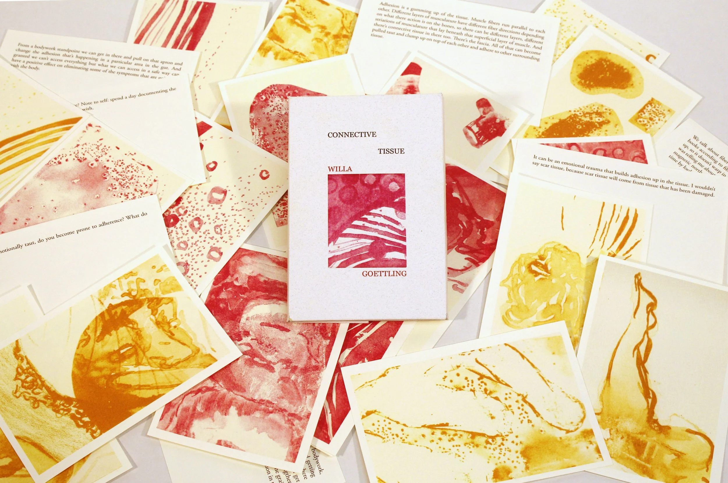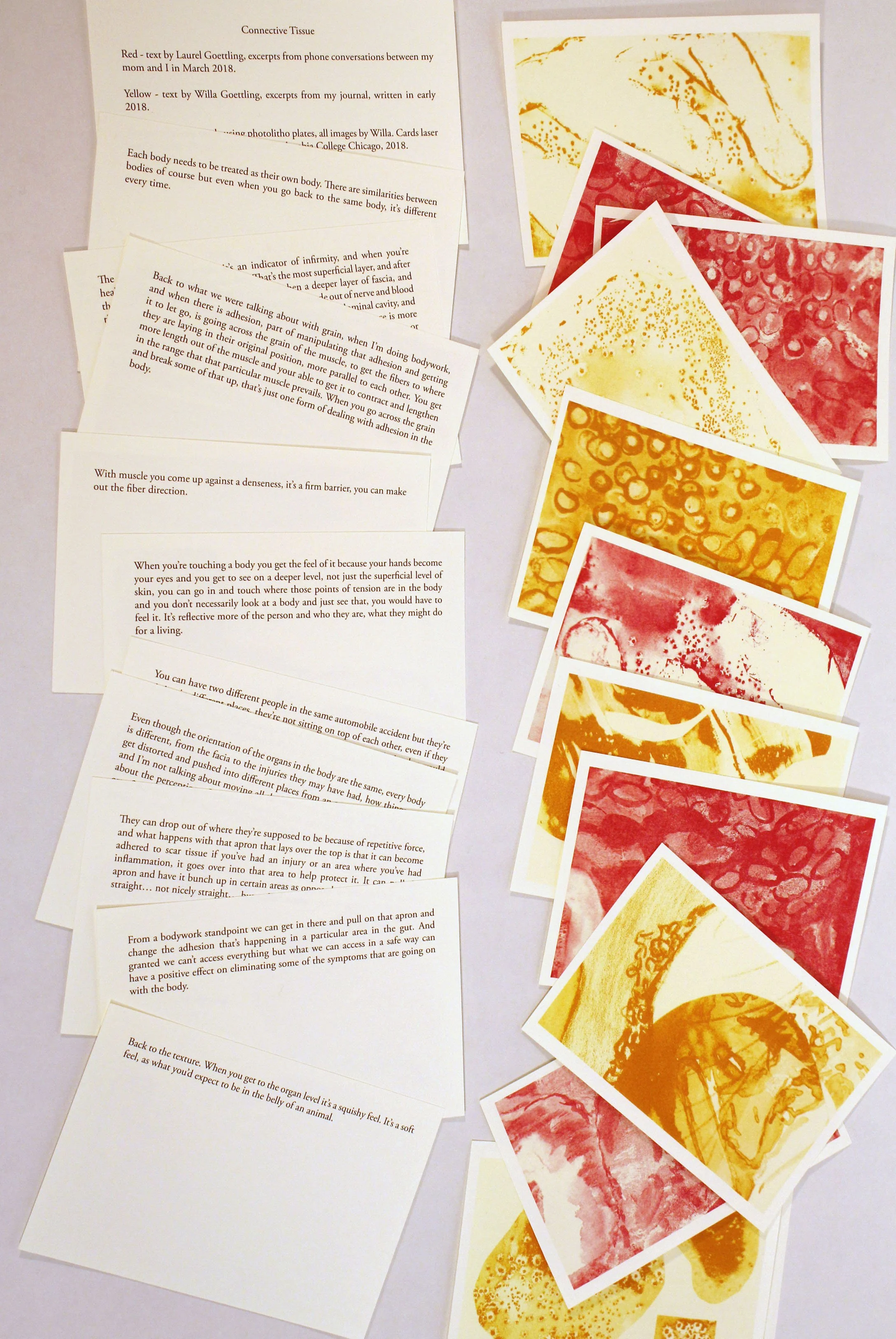 Connective Tissue is an artists’ book made of 30 double sided cards and a handmade box. This project is an intergenerational and familial comparison of corporeal experience. For Connective Tissue, I interviewed my mom, a physical rehabilitation therapist, about the ways she thinks about health and illness. In the book I intertwine her narrative with my own. What results is an intergenerational look at what’s passed down, and what isn’t, in the ways we navigate bodily experience. The front of the cards display images echoing the body, originally produced as photo-lithographic prints. The back of the cards display text.